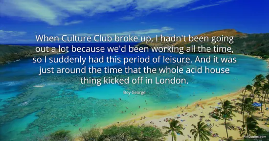 George, Boy. "When Culture Club broke up, I hadn't been going out a lot because we'd been working all the time, so I suddenly had this period of leisure. And it was just around the time that the whole acid house thing kicked off in London." FixQuotes. January 15, 2026. https://fixquotes.com/quotes/when-culture-club-broke-up-i-hadnt-been-going-out-139866/.