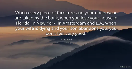 Goldstein, Al. "When every piece of furniture and your underwear are taken by the bank, when you lose your house in Florida, in New York, in Amsterdam and L.A., when your wife is dying and your son abandons you, you don't feel very good." FixQuotes. January 18, 2026. https://fixquotes.com/quotes/when-every-piece-of-furniture-and-your-underwear-21518/.