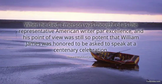 Jones, Howard Mumford. "When he died, Emerson was thought of as the representative American writer par excellence, and his point of view was still so potent that William James was honored to be asked to speak at a centenary celebration." FixQuotes. January 15, 2026. https://fixquotes.com/quotes/when-he-died-emerson-was-thought-of-as-the-169436/.