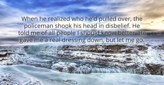 "When he realized who he'd pulled over, the policeman shook his head in disbelief. He told me of all people I should know better. He gave me a real dressing down, but let me go." FixQuotes, 17 Jan. 2026, https://fixquotes.com/quotes/when-he-realized-who-hed-pulled-over-the-60573/. Accessed 12 Feb. 2026.