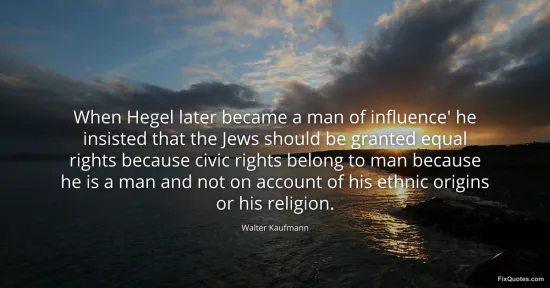 Kaufmann, Walter. "When Hegel later became a man of influence' he insisted that the Jews should be granted equal rights because civic rights belong to man because he is a man and not on account of his ethnic origins or his religion." FixQuotes. January 16, 2026. https://fixquotes.com/quotes/when-hegel-later-became-a-man-of-influence-he-108107/.