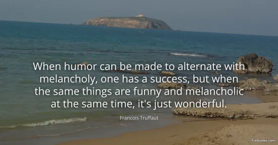 Truffaut, Francois. (2026, January 15). When humor can be made to alternate with melancholy, one has a success, but when the same things are funny and melancholic at the same time, it's just wonderful. FixQuotes. https://fixquotes.com/quotes/when-humor-can-be-made-to-alternate-with-148160/