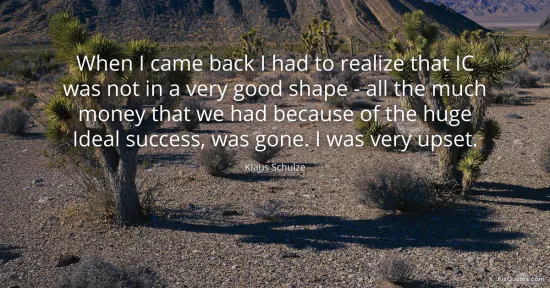 Schulze, Klaus. (2026, January 15). When I came back I had to realize that IC was not in a very good shape - all the much money that we had because of the huge Ideal success, was gone. I was very upset. FixQuotes. https://fixquotes.com/quotes/when-i-came-back-i-had-to-realize-that-ic-was-not-152572/
