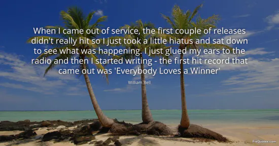 Bell, William. "When I came out of service, the first couple of releases didn't really hit so I just took a little hiatus and sat down to see what was happening. I just glued my ears to the radio and then I started writing - the first hit record that came out was 'Everybody Loves a Winner'." FixQuotes. February 16, 2026. https://fixquotes.com/quotes/when-i-came-out-of-service-the-first-couple-of-151633/.