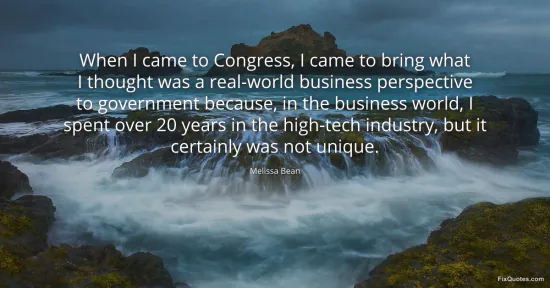 Bean, Melissa. "When I came to Congress, I came to bring what I thought was a real-world business perspective to government because, in the business world, I spent over 20 years in the high-tech industry, but it certainly was not unique." FixQuotes. January 17, 2026. https://fixquotes.com/quotes/when-i-came-to-congress-i-came-to-bring-what-i-80004/.