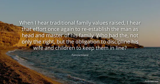 Ireland, Patricia. "When I hear traditional family values raised, I hear that effort once again to re-establish the man as head and master of his family. Who had the, not only the right, but the obligation to discipline his wife and children to keep them in line?" FixQuotes. January 15, 2026. https://fixquotes.com/quotes/when-i-hear-traditional-family-values-raised-i-151124/.