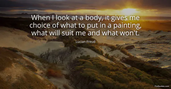 Freud, Lucian. "When I look at a body, it gives me choice of what to put in a painting, what will suit me and what won't." FixQuotes. February 16, 2026. https://fixquotes.com/quotes/when-i-look-at-a-body-it-gives-me-choice-of-what-147538/.