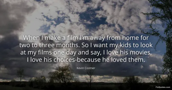 Costner, Kevin. (2026, January 16). When I make a film I'm away from home for two to three months. So I want my kids to look at my films one day and say, I love his movies, I love his choices-because he loved them. FixQuotes. https://fixquotes.com/quotes/when-i-make-a-film-im-away-from-home-for-two-to-113959/