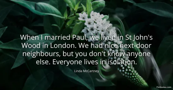 McCartney, Linda. "When I married Paul, we lived in St John's Wood in London. We had nice next-door neighbours, but you don't know anyone else. Everyone lives in isolation." FixQuotes. January 16, 2026. https://fixquotes.com/quotes/when-i-married-paul-we-lived-in-st-johns-wood-in-103810/.