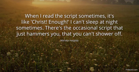 Hargitay, Mariska. "When I read the script sometimes, it's like 'Christ! Enough!' I can't sleep at night sometimes. There's the occasional script that just hammers you, that you can't shower off." FixQuotes. January 16, 2026. https://fixquotes.com/quotes/when-i-read-the-script-sometimes-its-like-christ-100174/.