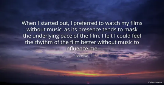 Hirsch, Paul. "When I started out, I preferred to watch my films without music, as its presence tends to mask the underlying pace of the film. I felt I could feel the rhythm of the film better without music to influence me." FixQuotes. January 16, 2026. https://fixquotes.com/quotes/when-i-started-out-i-preferred-to-watch-my-films-132523/.