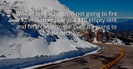 Bush, George W. (2026, January 18). When I take action, I'm not going to fire a $2 million missile at a $10 empty tent and hit a camel in the butt. It's going to be decisive. FixQuotes. https://fixquotes.com/quotes/when-i-take-action-im-not-going-to-fire-a-2-7306/
