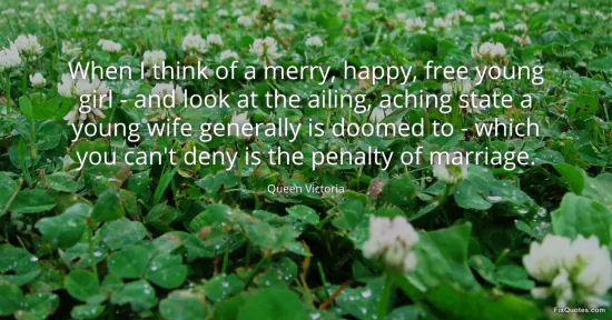 Victoria, Queen. "When I think of a merry, happy, free young girl - and look at the ailing, aching state a young wife generally is doomed to - which you can't deny is the penalty of marriage." FixQuotes. January 18, 2026. https://fixquotes.com/quotes/when-i-think-of-a-merry-happy-free-young-girl-15479/.