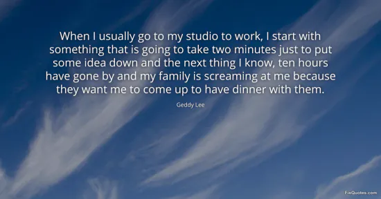 Lee, Geddy. "When I usually go to my studio to work, I start with something that is going to take two minutes just to put some idea down and the next thing I know, ten hours have gone by and my family is screaming at me because they want me to come up to have dinner with them." FixQuotes. January 17, 2026. https://fixquotes.com/quotes/when-i-usually-go-to-my-studio-to-work-i-start-55151/.