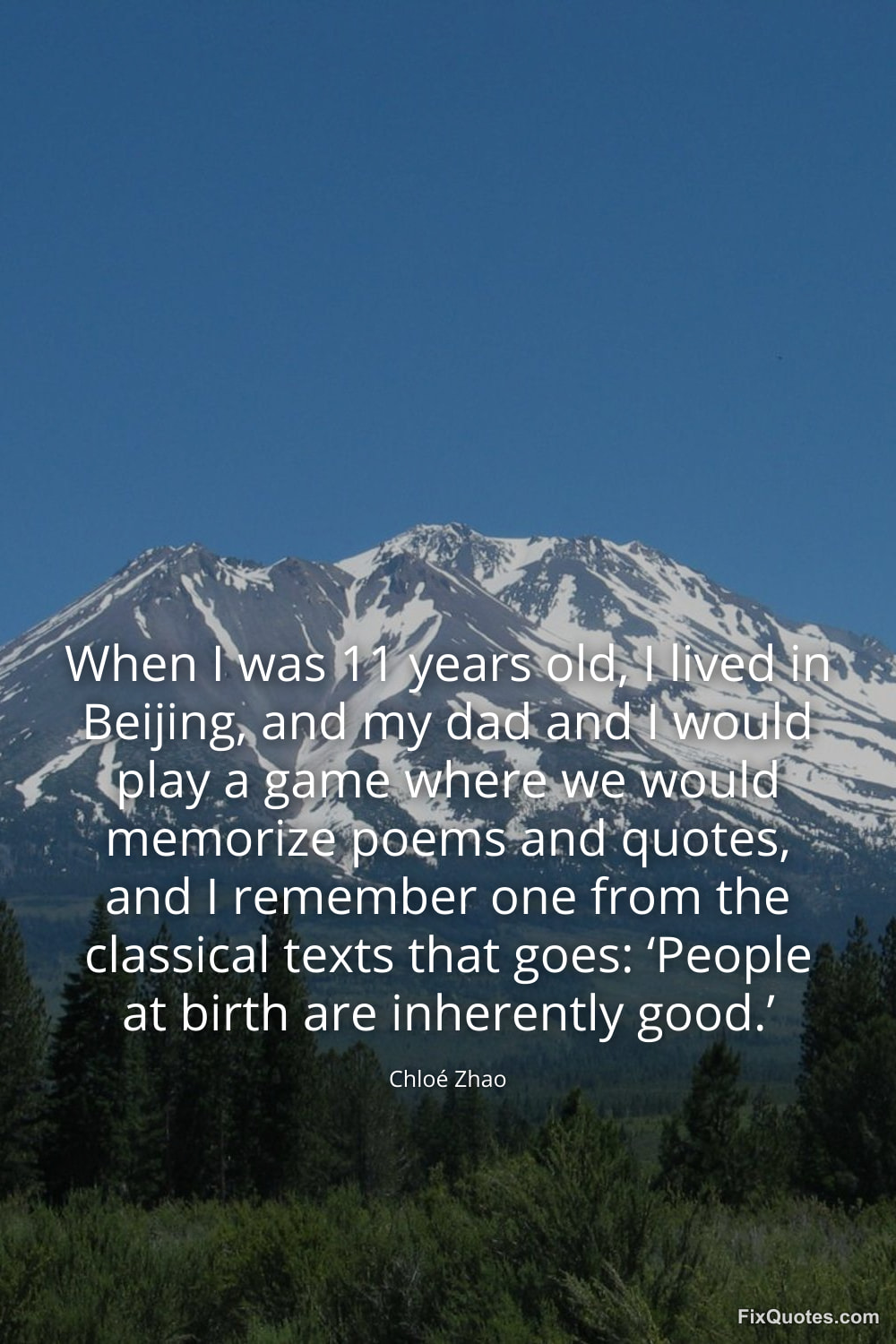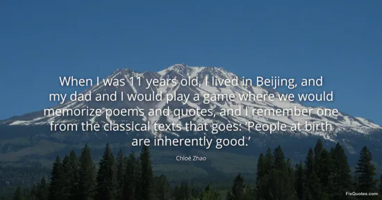 Zhao, Chloé. (2026, January 25). When I was 11 years old, I lived in Beijing, and my dad and I would play a game where we would memorize poems and quotes, and I remember one from the classical texts that goes: ‘People at birth are inherently good.’. FixQuotes. https://fixquotes.com/quotes/when-i-was-11-years-old-i-lived-in-beijing-and-my-184246/