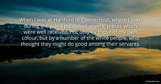 Hammon, Jupiter. "When I was at Hartford in Connecticut, where I lived during the war, I published several pieces which were well received, not only by those of my own colour, but by a number of the white people, who thought they might do good among their servants." FixQuotes. January 16, 2026. https://fixquotes.com/quotes/when-i-was-at-hartford-in-connecticut-where-i-93148/.