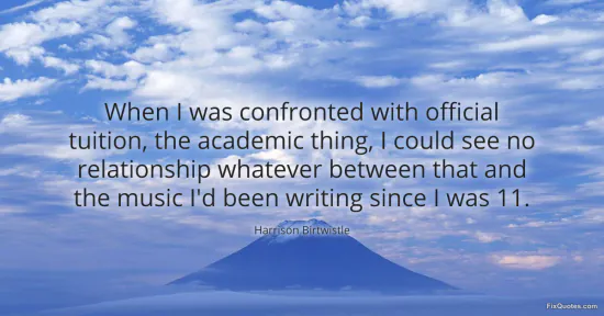 Birtwistle, Harrison. "When I was confronted with official tuition, the academic thing, I could see no relationship whatever between that and the music I'd been writing since I was 11." FixQuotes. January 15, 2026. https://fixquotes.com/quotes/when-i-was-confronted-with-official-tuition-the-158399/.