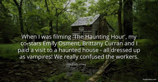 Linley, Cody. "When I was filming 'The Haunting Hour', my co-stars Emily Osment, Brittany Curran and I paid a visit to a haunted house - all dressed up as vampires! We really confused the workers." FixQuotes. January 15, 2026. https://fixquotes.com/quotes/when-i-was-filming-the-haunting-hour-my-co-stars-158021/.