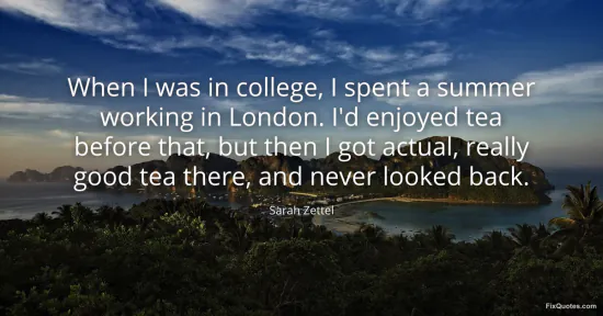 Zettel, Sarah. "When I was in college, I spent a summer working in London. I'd enjoyed tea before that, but then I got actual, really good tea there, and never looked back." FixQuotes. February 18, 2026. https://fixquotes.com/quotes/when-i-was-in-college-i-spent-a-summer-working-in-72320/.