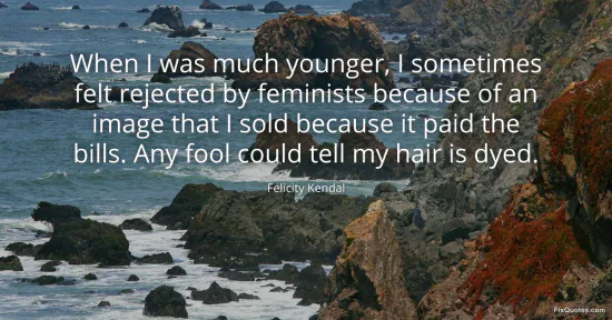 Kendal, Felicity. "When I was much younger, I sometimes felt rejected by feminists because of an image that I sold because it paid the bills. Any fool could tell my hair is dyed." FixQuotes. January 17, 2026. https://fixquotes.com/quotes/when-i-was-much-younger-i-sometimes-felt-rejected-59160/.