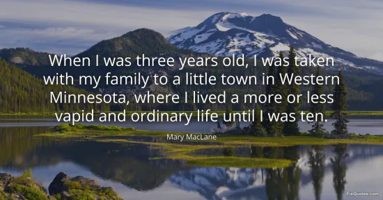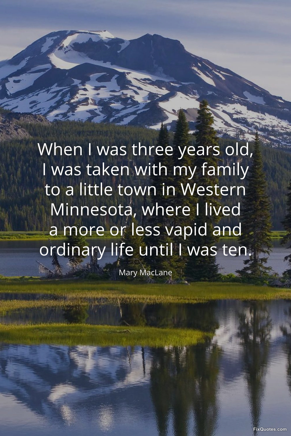 MacLane, Mary. "When I was three years old, I was taken with my family to a little town in Western Minnesota, where I lived a more or less vapid and ordinary life until I was ten." FixQuotes. February 17, 2026. https://fixquotes.com/quotes/when-i-was-three-years-old-i-was-taken-with-my-99533/.