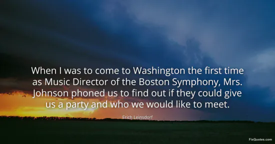 Leinsdorf, Erich. "When I was to come to Washington the first time as Music Director of the Boston Symphony, Mrs. Johnson phoned us to find out if they could give us a party and who we would like to meet." FixQuotes. January 16, 2026. https://fixquotes.com/quotes/when-i-was-to-come-to-washington-the-first-time-120211/.
