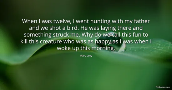 Levy, Marv. (2026, January 15). When I was twelve, I went hunting with my father and we shot a bird. He was laying there and something struck me. Why do we call this fun to kill this creature who was as happy as I was when I woke up this morning. FixQuotes. https://fixquotes.com/quotes/when-i-was-twelve-i-went-hunting-with-my-father-168084/