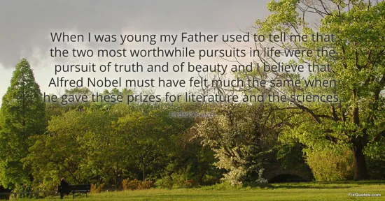 "When I was young my Father used to tell me that the two most worthwhile pursuits in life were the pursuit of truth and of beauty and I believe that Alfred Nobel must have felt much the same when he gave these prizes for literature and the sciences." FixQuotes, 15 Jan. 2026, https://fixquotes.com/quotes/when-i-was-young-my-father-used-to-tell-me-that-59484/. Accessed 13 Feb. 2026.