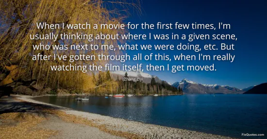 Ziyi, Zhang. (2026, February 16). When I watch a movie for the first few times, I'm usually thinking about where I was in a given scene, who was next to me, what we were doing, etc. But after I've gotten through all of this, when I'm really watching the film itself, then I get moved. FixQuotes. https://fixquotes.com/quotes/when-i-watch-a-movie-for-the-first-few-times-im-150240/