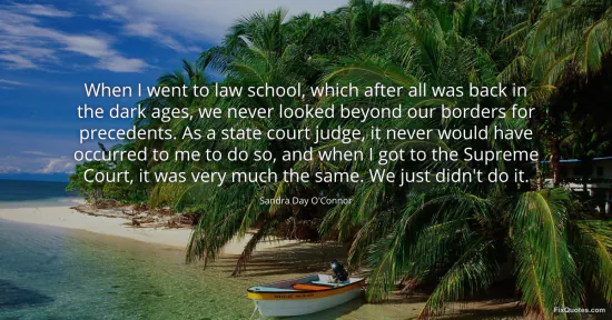 O'Connor, Sandra Day. "When I went to law school, which after all was back in the dark ages, we never looked beyond our borders for precedents. As a state court judge, it never would have occurred to me to do so, and when I got to the Supreme Court, it was very much the same. We just didn't do it." FixQuotes. January 16, 2026. https://fixquotes.com/quotes/when-i-went-to-law-school-which-after-all-was-89820/.