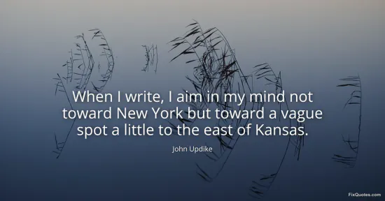 Updike, John. (2026, January 18). When I write, I aim in my mind not toward New York but toward a vague spot a little to the east of Kansas. FixQuotes. https://fixquotes.com/quotes/when-i-write-i-aim-in-my-mind-not-toward-new-york-10529/