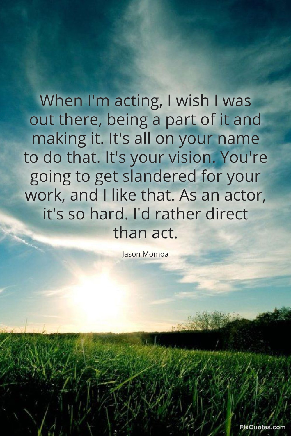 Momoa, Jason. (2026, January 26). When I'm acting, I wish I was out there, being a part of it and making it. It's all on your name to do that. It's your vision. You're going to get slandered for your work, and I like that. As an actor, it's so hard. I'd rather direct than act. FixQuotes. https://fixquotes.com/quotes/when-im-acting-i-wish-i-was-out-there-being-a-184509/