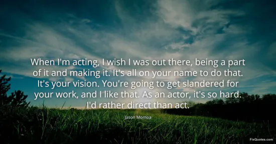Momoa, Jason. "When I'm acting, I wish I was out there, being a part of it and making it. It's all on your name to do that. It's your vision. You're going to get slandered for your work, and I like that. As an actor, it's so hard. I'd rather direct than act." FixQuotes. January 26, 2026. https://fixquotes.com/quotes/when-im-acting-i-wish-i-was-out-there-being-a-184509/.