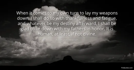Stevenson, Robert Louis. (2026, February 19). When it comes to my own turn to lay my weapons down, I shall do so with thankfulness and fatigue, and whatever be my destiny afterward, I shall be glad to lie down with my fathers in honor. It is human, at least, if not divine. FixQuotes. https://fixquotes.com/quotes/when-it-comes-to-my-own-turn-to-lay-my-weapons-33421/