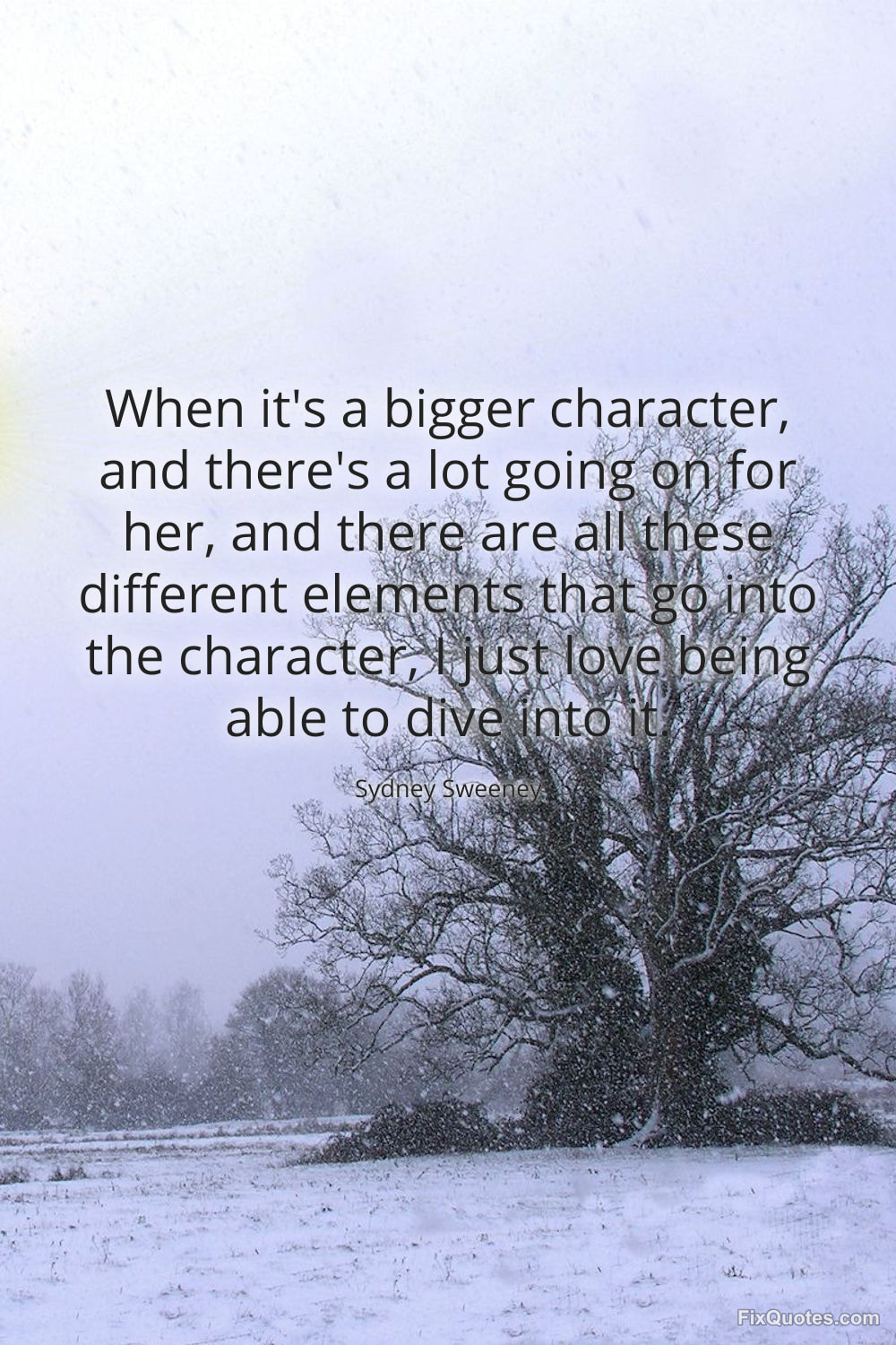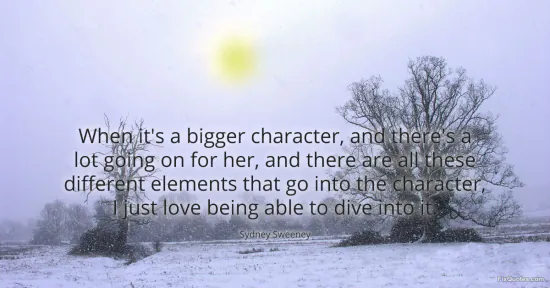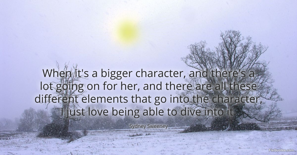 Sweeney, Sydney. "When it's a bigger character, and there's a lot going on for her, and there are all these different elements that go into the character, I just love being able to dive into it." FixQuotes. January 11, 2026. https://fixquotes.com/quotes/when-its-a-bigger-character-and-theres-a-lot-183798/.