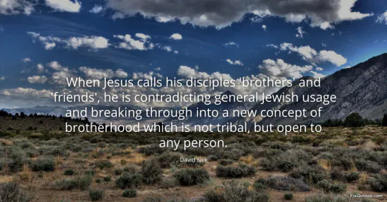Kirk, David. (2026, January 16). When Jesus calls his disciples 'brothers' and 'friends', he is contradicting general Jewish usage and breaking through into a new concept of brotherhood which is not tribal, but open to any person. FixQuotes. https://fixquotes.com/quotes/when-jesus-calls-his-disciples-brothers-and-135968/