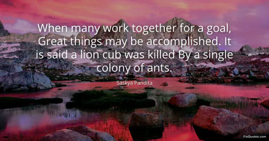 Pandita, Saskya. "When many work together for a goal, Great things may be accomplished. It is said a lion cub was killed By a single colony of ants." FixQuotes. January 15, 2026. https://fixquotes.com/quotes/when-many-work-together-for-a-goal-great-things-65645/.