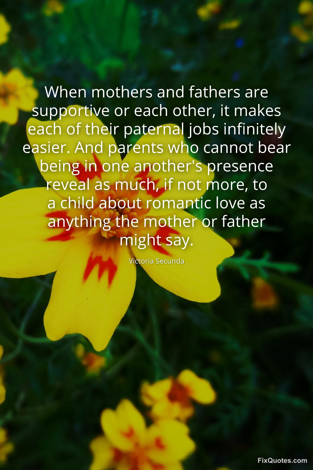 Secunda, Victoria. (2026, January 15). When mothers and fathers are supportive or each other, it makes each of their paternal jobs infinitely easier. And parents who cannot bear being in one another's presence reveal as much, if not more, to a child about romantic love as anything the mother or father might say. FixQuotes. https://fixquotes.com/quotes/when-mothers-and-fathers-are-supportive-or-each-173156/