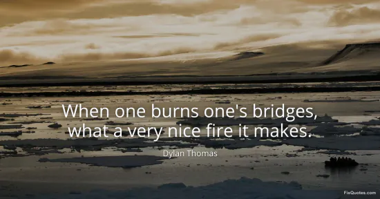 Thomas, Dylan. "When one burns one's bridges, what a very nice fire it makes." FixQuotes. January 17, 2026. https://fixquotes.com/quotes/when-one-burns-ones-bridges-what-a-very-nice-fire-52901/.