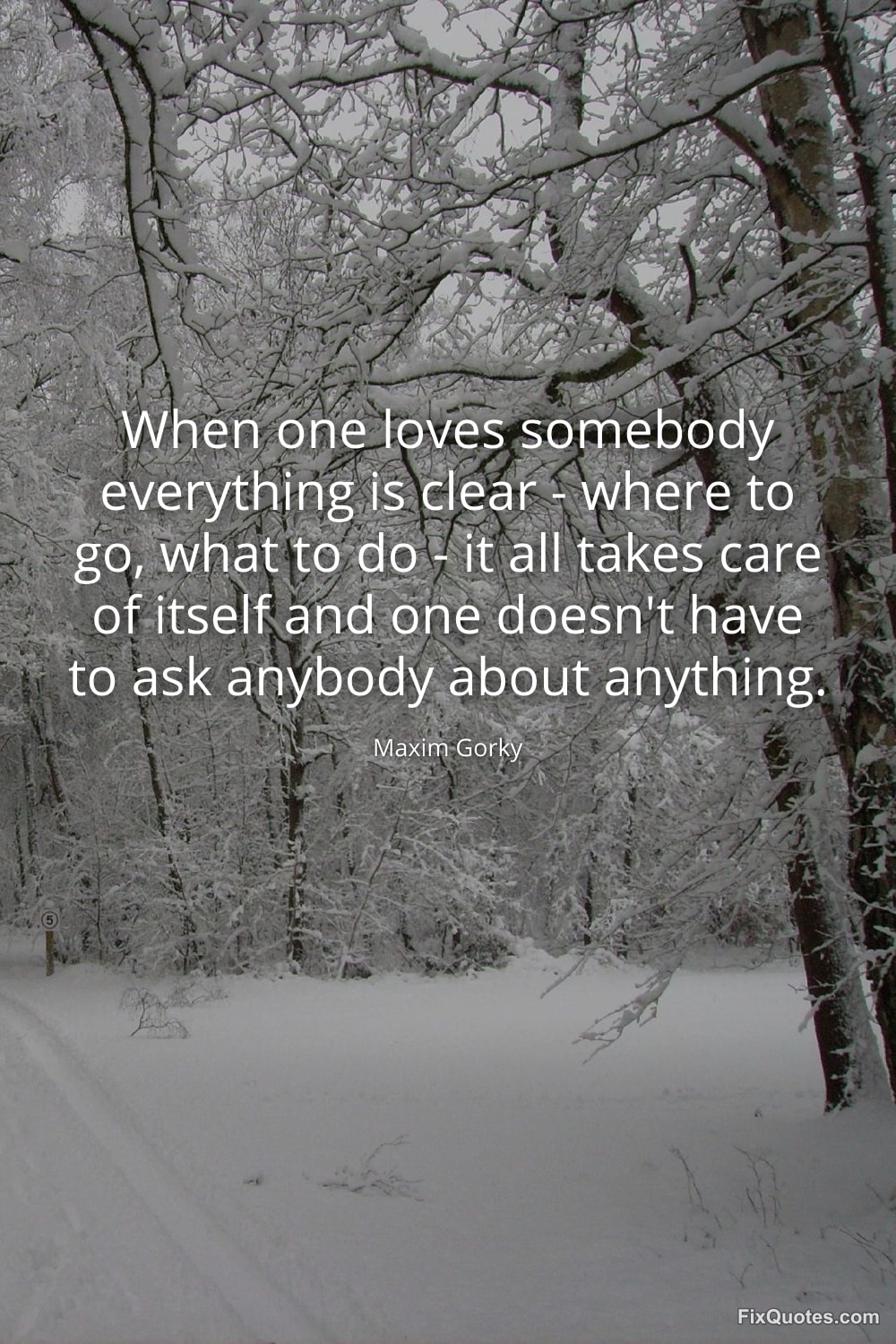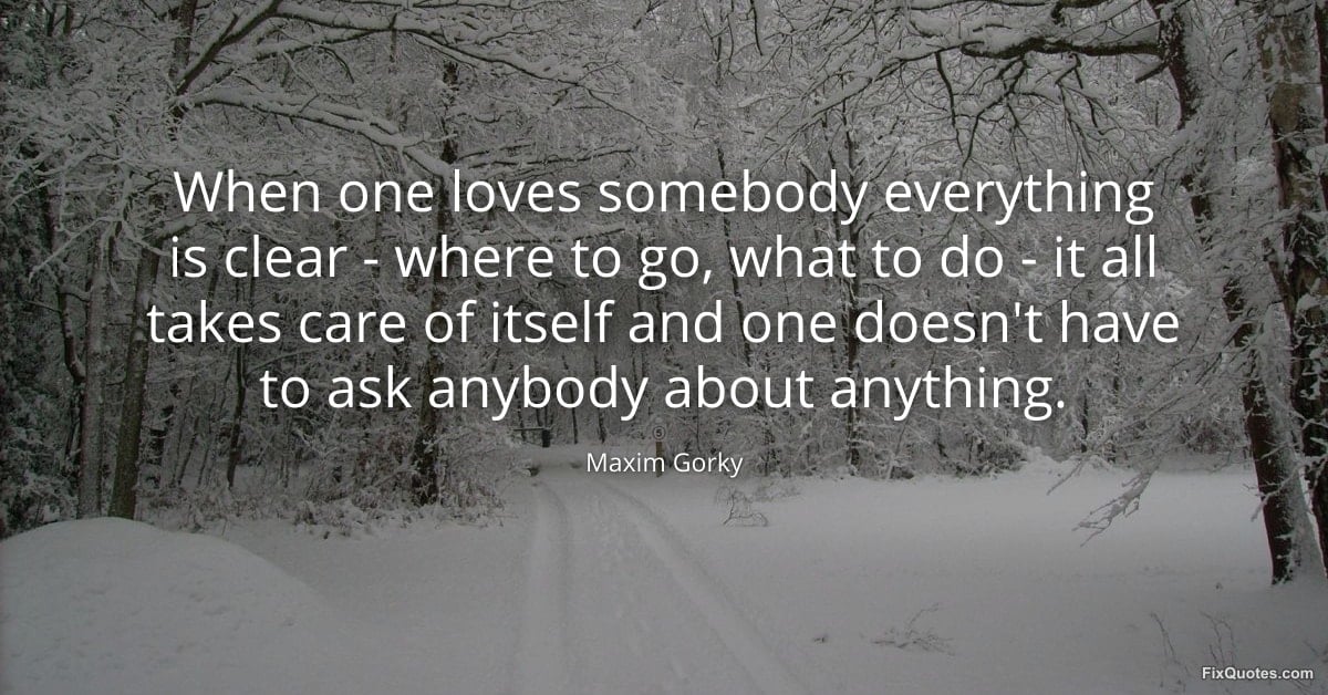 Gorky, Maxim. (2026, January 18). When one loves somebody everything is clear - where to go, what to do - it all takes care of itself and one doesn't have to ask anybody about anything. FixQuotes. https://fixquotes.com/quotes/when-one-loves-somebody-everything-is-clear-7206/