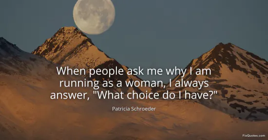 Schroeder, Patricia. (2026, January 17). When people ask me why I am running as a woman, I always answer, "What choice do I have?". FixQuotes. https://fixquotes.com/quotes/when-people-ask-me-why-i-am-running-as-a-woman-i-26684/