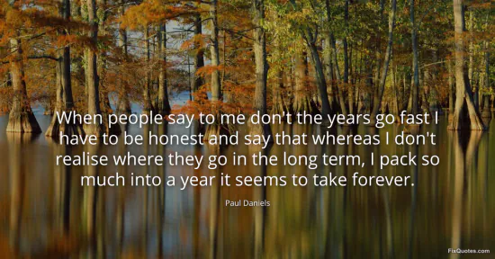 Daniels, Paul. "When people say to me don't the years go fast I have to be honest and say that whereas I don't realise where they go in the long term, I pack so much into a year it seems to take forever." FixQuotes. January 17, 2026. https://fixquotes.com/quotes/when-people-say-to-me-dont-the-years-go-fast-i-76847/.