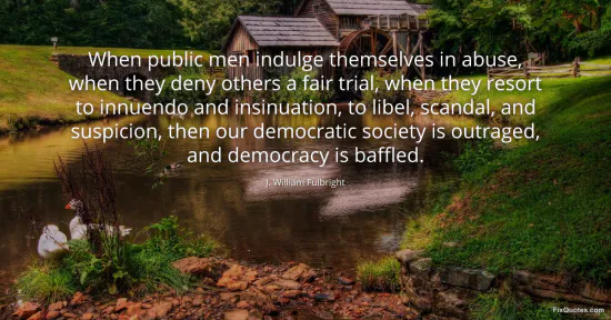 Fulbright, J. William. "When public men indulge themselves in abuse, when they deny others a fair trial, when they resort to innuendo and insinuation, to libel, scandal, and suspicion, then our democratic society is outraged, and democracy is baffled." FixQuotes. January 17, 2026. https://fixquotes.com/quotes/when-public-men-indulge-themselves-in-abuse-when-54112/.