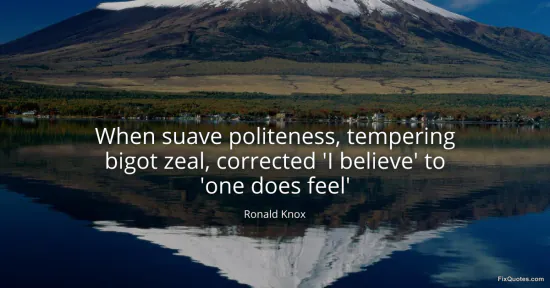 Knox, Ronald. (2026, January 18). When suave politeness, tempering bigot zeal, corrected 'I believe' to 'one does feel'. FixQuotes. https://fixquotes.com/quotes/when-suave-politeness-tempering-bigot-zeal-21779/