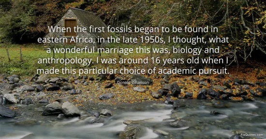Johanson, Donald. "When the first fossils began to be found in eastern Africa, in the late 1950s, I thought, what a wonderful marriage this was, biology and anthropology. I was around 16 years old when I made this particular choice of academic pursuit." FixQuotes. January 17, 2026. https://fixquotes.com/quotes/when-the-first-fossils-began-to-be-found-in-52599/.