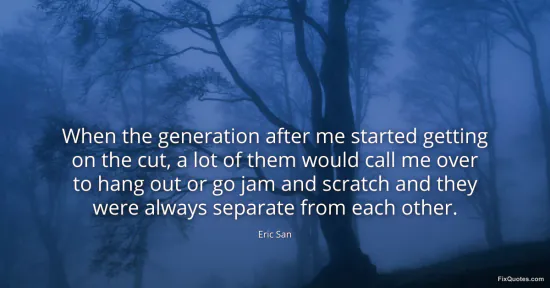 San, Eric. "When the generation after me started getting on the cut, a lot of them would call me over to hang out or go jam and scratch and they were always separate from each other." FixQuotes. January 17, 2026. https://fixquotes.com/quotes/when-the-generation-after-me-started-getting-on-56675/.
