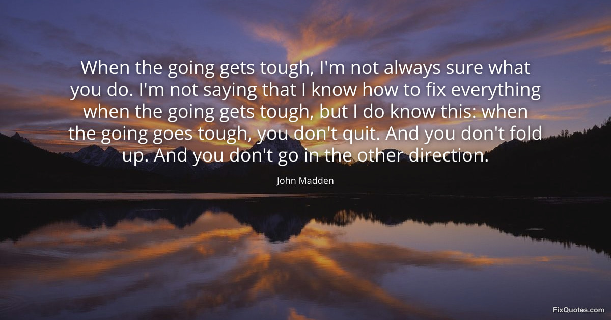 Madden, John. (2026, January 15). When the going gets tough, I'm not always sure what you do. I'm not saying that I know how to fix everything when the going gets tough, but I do know this: when the going goes tough, you don't quit. And you don't fold up. And you don't go in the other direction. FixQuotes. https://fixquotes.com/quotes/when-the-going-gets-tough-im-not-always-sure-what-173573/