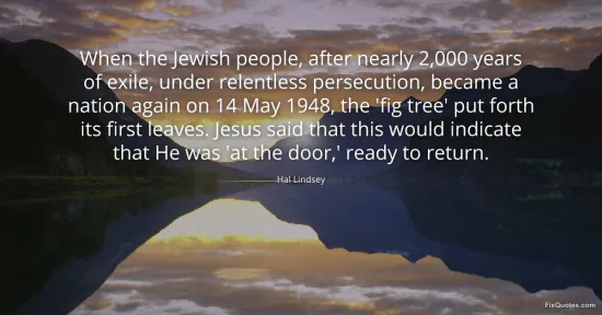 Lindsey, Hal. "When the Jewish people, after nearly 2,000 years of exile, under relentless persecution, became a nation again on 14 May 1948, the 'fig tree' put forth its first leaves. Jesus said that this would indicate that He was 'at the door,' ready to return." FixQuotes. February 16, 2026. https://fixquotes.com/quotes/when-the-jewish-people-after-nearly-2000-years-of-170037/.