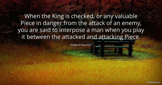 Staunton, Howard. "When the King is checked, or any valuable Piece in danger from the attack of an enemy, you are said to interpose a man when you play it between the attacked and attacking Piece." FixQuotes. January 18, 2026. https://fixquotes.com/quotes/when-the-king-is-checked-or-any-valuable-piece-in-13431/.