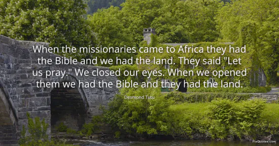 "When the missionaries came to Africa they had the Bible and we had the land. They said "Let us pray." We closed our eyes. When we opened them we had the Bible and they had the land"